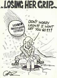Scope and ContentCartoon headed Losing her grip, with an image of Margaret Thatcher holding on to two arms protruding from a hole labelled Resignation! whilst a snowball labelled Leaked Westland letter! rolls down a hill behind her She is saying: Don't worry Leon!! I won't let you go!!!