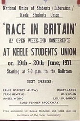 Scope and ContentPoster with the text: National Union of Students / Liberation / Keele Students Union. Race in Britain. An open week-end conference at Keele Students Union on 19th-20th June 1971 starting at 2pm in the Ballroom. Guest speakers: Ernie Roberts (AUEW), Stan Newens, Ansel Wong, Digby Jacks, Gus John, Lou Kushnick, Lord Fenner Brockway. Free admission for Keele students and staff and for members of the local community