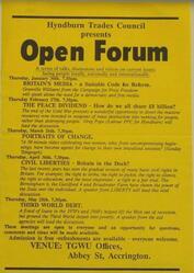 Scope and ContentPoster headed: Hyndburn Trades Council presents Open Forum, a series of talks, discussions and videos on current issues facing people locally, nationally and internationally - with a list of forums taking place between 30 Jan and 28 May [no year] in the TGWU Offices, Accrington