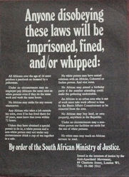 Scope and ContentPoster with the text: Anyone disobeying these laws will be imprisoned, fined, and/or whipped. [With details of the various laws] By order of the South African Ministry of Justice. Issued in the interests of justice by the Anti-Apartheid Movement