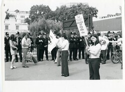 Scope and ContentBlack and white photograph of a group of demonstrators and police at an End internment, release political prisoners demonstration, London, Summer 1974. One demonstrator is holding a placard and two others are holding flags