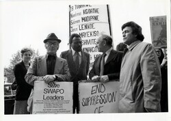 Scope and ContentBlack and white photograph of the SWAPO (South West Africa People's Organisation) picket outside South Africa House, London. In the foreground are a woman and four men, behind them is the bottom portion of a banner with a list of people known to have died in detention in South Africa. The men (L to R) are: Eddie Loyden (MP for Liverpool Garston), Peter Catjariri (SWAPO representative), Tom Litterick (MP for Birmingham Selly Oak) and Ron Thomas (MP for Bristol North West)