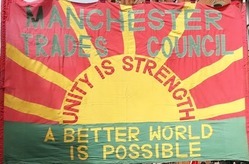 Scope and ContentRed cotton banner with Manchester Trades Council in green cotton lettering, Unity is strength in red cotton lettering, A better world is possible in yellow cotton lettering on a green cotton background. In the background is a half yellow sun with rays in cotton. All additions sewn on