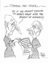 Scope and ContentCartoon headed Joining the flock, with an image of two priests. One is holding a newspaper with the headling Campaigning Archdeacon Wilfred Wood becomes Britain's first black bishop! and the other is saying to him: As if we haven't enough to worry about with the Bishop of Durham?!