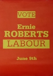 Scope and ContentPoster with the text: Vote Ernie Roberts, Labour, June 9th. Published by Bill Brown, 96a Stoke Newington High Street, London [election agent]
