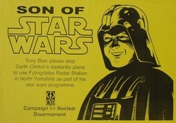 Scope and ContentPoster with an image of Tony Blair as Darth Vader and the text: Son of Star Wars. Tony Blair please stop Darth Clinton's dastardly plans to use Fylingdales Radar Station in North Yorkshire as part of his star wars programme